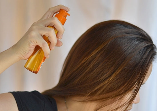 Нанесите специальный спрей для защиты волос от термического воздействия при использовании утюжка. Спрей следует нанести на всю поверхность головы и распределить его по волосам с помощью расчески. Если под рукой не оказалось расчески, можно сделать это пальцами.