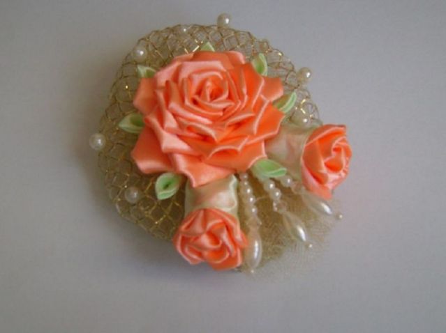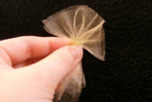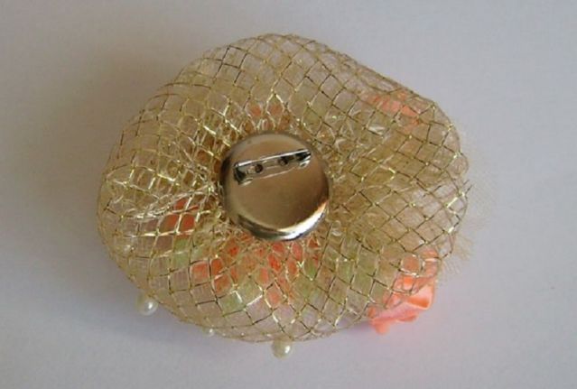 - Создать воздушную основу для броши в технике канзаши. Фатин поместить внутрь «сеточки». Бежевой нитью пройти край с изнаночной стороны по обоим отрезкам.