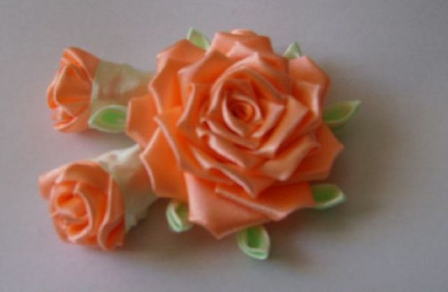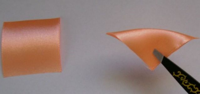 - От зелёной ленты отрезать 2 кусочка по 6 см. Края обработать огнём. Обернуть ими краешки персиковых заготовок. Закрепить клеем.