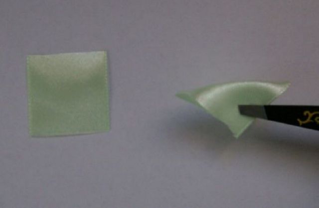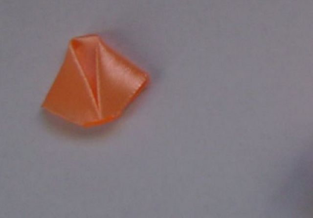 - Взять ленту персикового цвета. Нарезать из неё 28 квадратов со стороной 4 см. Подготовить 1 экземпляр. Пополам согнуть. Вот треугольник.