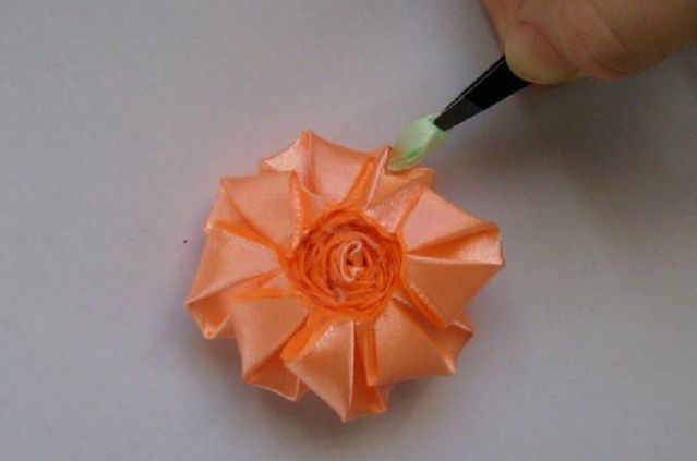 - Выполняя далее своими руками брошь канзаши, осторожно закрепить к большому цветку зелёные краешки бутончиков.