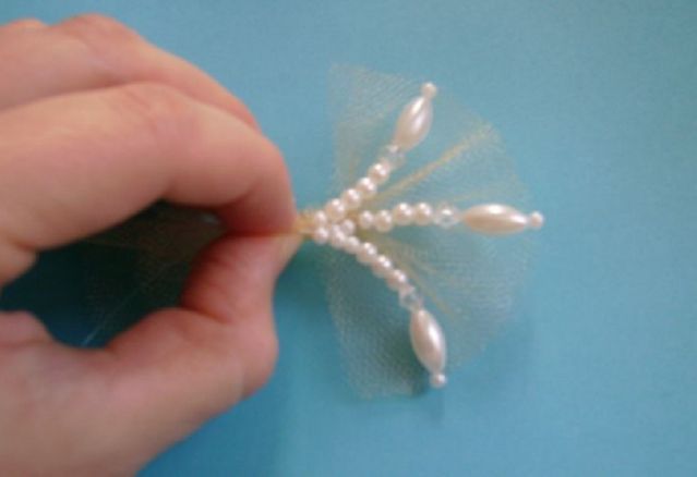 - Отрезать 18 см от лески. На неё закрепить бусинку. Перегнуть заготовку по центру. Продеть ещё одну бусину сразу на 2 краешки основы. Следуя этому принципу, отправить на леску 3 бусинки с диаметром 2 мм. Потом – ещё 3, но с диаметром в 1 мм. Сделать 3 подобных элемента. Всё соединить в единую композицию. На розочку с оборотной стороны капнуть горячего клея. Закрепить леску с бусинами и фатиновый краешек. Всё расположить равномерно. На элемент из «сетки» закрепить цветочки. Произвольно закрепить оставшиеся бусины. Не забудьте зафиксировать и крепление для броши канзаши, выполненной своими руками.