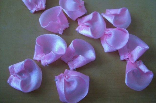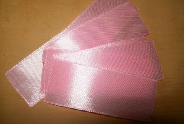 - Подготовить 17 полосок из розовой ленты. Длина каждой – 6.5 см. Срезы пройти зажигалкой или терморезкой.