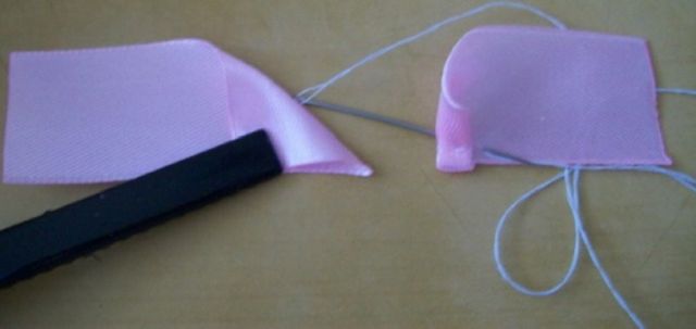 - Отрезать от куска сатина элемент 7х12 см. Пополам разрезать его. Собрать в «гармошку». Закрепить ниткой. Оставшийся краешек будет в виде веера.