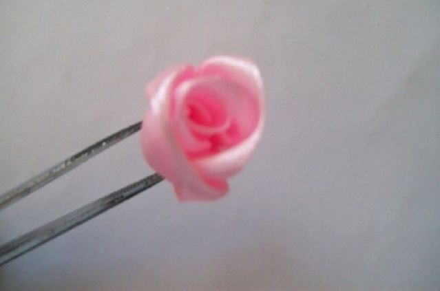 - Результатом окажется объёмный бутон, выполненный из атласных лент канзаши.