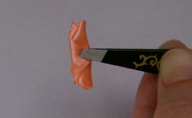 - Далее изготовление броши канзаши из атласных лент по МК предполагает сворачивание фрагмента. Будет трубочка. Её надо закрепить клеем.