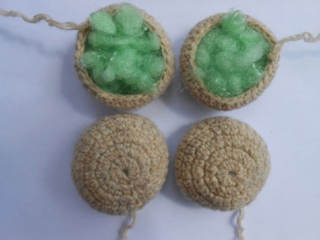 Сделать 4 одинаковых деталей. Наполнить их материалом для набивки, оставить длинную нить.