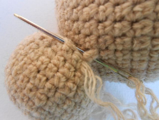 Набить наполнителем. Утягивать деталь не придется. Нужно лишь оставить длинную нить и пришить мордочку к голове, а ее в свою очередь – к туловищу.