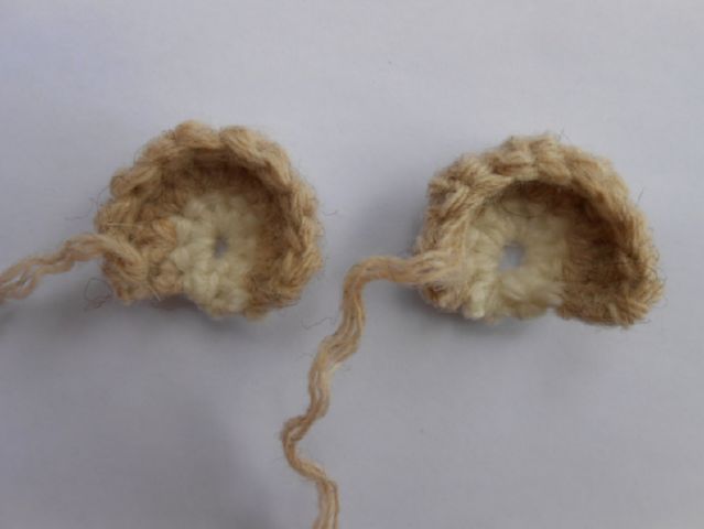 Контур ушек сделать из бежевого, а серединку – белого цвета. Сначла используется белая пряжа.