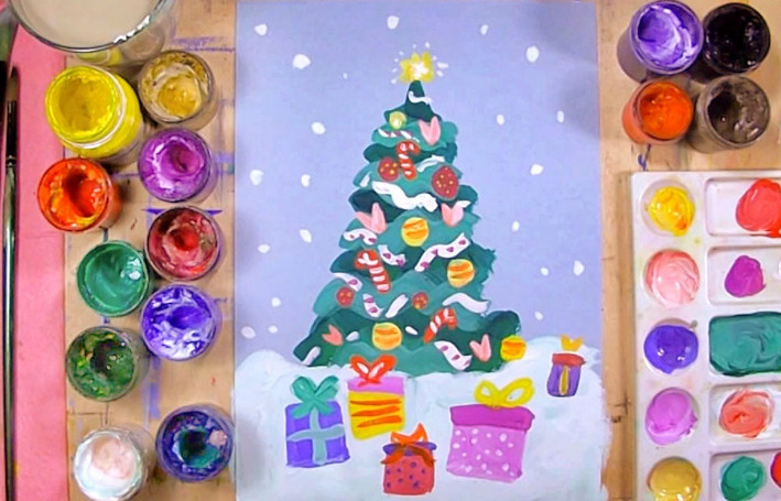 Новогодняя елка с игрушками и гирляндами – самый простой и в тоже время удачный вариант подарочного изображения. Ее можно презентовать и члену семьи, и учителю с воспитателем. С работой легко справится ребенок любого возраста, а рисунок получится ярким, колоритным и необыкновенно атмосферным.