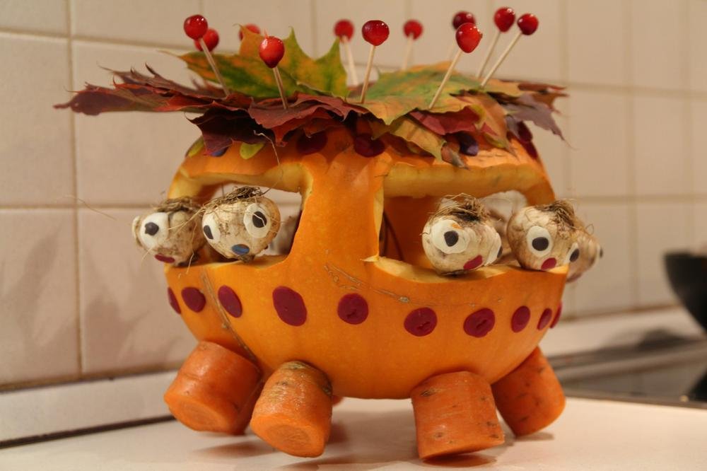 Либо сделать из тыквы, кабачков и головок репчатого лука в забавных улиток или гусениц.