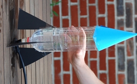 2. Приклейте к бутылке ребра и конус из картона, как показано на фото. У вас получилась ракета.