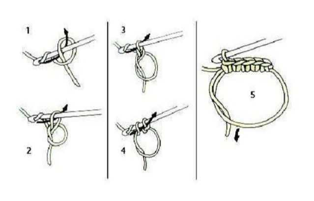 - Провязать еще пять аналогичных столбиков. Затем вытянуть нитку, образовав петлю побольше. Это необходимо для того, чтобы изделие не распустилось.