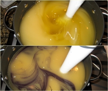 6. Подогреть оливковое масло до 110-115 градусов. Снять с огня. Влить сместь воды и щелока в масло.