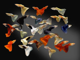 Гуппи — одни из самых популярных аквариумных рыбок. Они очень неприхотливы в содержании, просты в уходе, эффектно выглядят, а также легко размножаются и следят за чистотой аквариума. Самки у аквариумных рыбок гуппи чаще всего внешне совсем невзрачные: серо-серебристые с зеленоватым отливом. Зато самцы — сплошное загляденье: синие, зеленые, фиолетовые, красные, золотистые тельца испещрены яркими разноцветными точками и штрихами, а развевающиеся плавники бывают округлыми и треугольными, шлейфовыми и вуалевыми… Для этих маленьких (2-4 см) рыбок не нужны огромные аквариумы: парочка гуппи будет чувствовать себя комфортно и в трехлитровой банке. Для стайки рыбок нужен аквариум на 10-15 литров. Оптимальная температура для гуппи — 22-26 °С. Чтобы не поблекла яркая окраска рыбок, дополнительно осветите аквариум (не менее 12-14 часов в сутки).