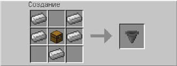 Для того чтобы создать данный предмет, нам понадобятся 5 железных слитков и сундук. Располагаем данные ингредиенты в правильном порядке и получаем воронку.