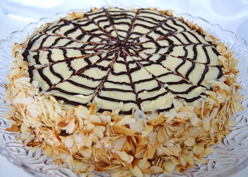 - Покрываем торт Эстерхази паутинкой из шоколада. Для этого 50 г чёрного шоколада нужно растопить. Бумажным конусом с дырочкой делаем по всей поверхности шоколадную спираль. После делим торт от середины до краёв на дольки. Должно получиться 8 частей. Делим каждую дольку ещё пополам. Бока украшаем орехами.