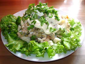 Дичь(мякоть) — 30 г, картофель — 30 г, огурцы свежие — 25 г, зеленый салат — 5 г, майонез — 35 г, соус «Южный» — 3 г, яйцо отварное — 20 г, шейки рака -5 г, черные маслины без косточек -2 г.