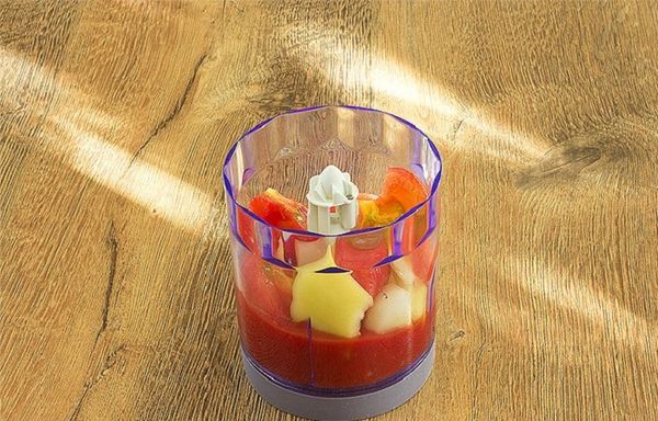 - Переложить овощи в блендер и измельчить. Затем добавить томатный сок, специи, соль, оливковое масло, лук и чеснок, потом снова перемешать. В результате должна получиться кашеобразная однородная масса.
