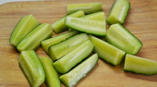 - Огурцы очистить от кожуры. Нарезать их кусочками.