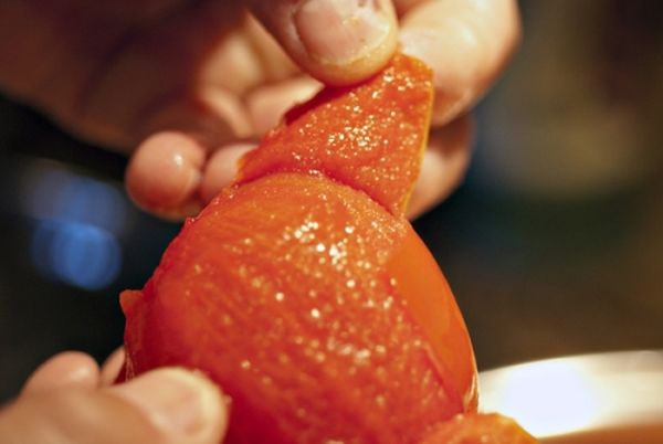 - Помидоры залить кипятком и снять шкурку. Избавить овощи от семян.