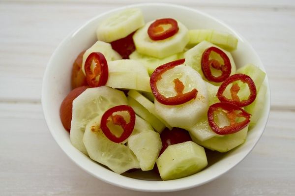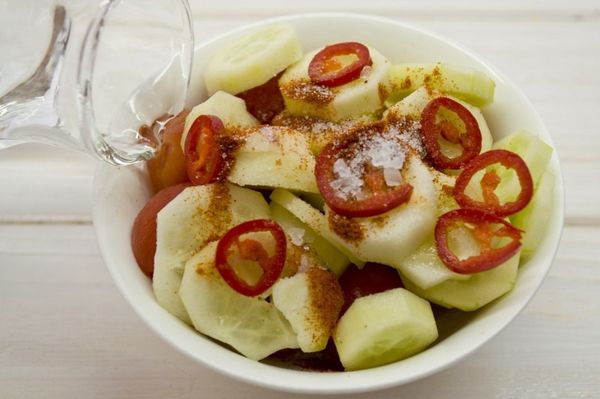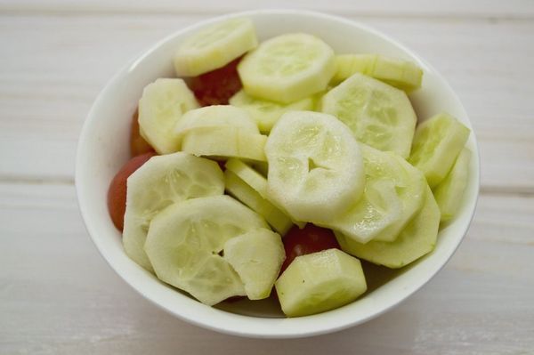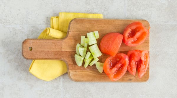 - Пока лук маринуется, можно заняться подготовкой других ингредиентов. Со свежих помидоров нужно снять шкурку. Для этого следует опустить их в кипяток на 1 минуту. Предварительно можно сделать крестообразный надрез с одной стороны овоща, что облегчит удаление шкурки. Помидоры разрезать на 4 части, избавиться от семян. Огурцы также очистить и нарезать.