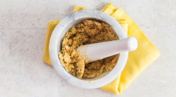- В ступке растолочь хлеб, чеснок и соль.