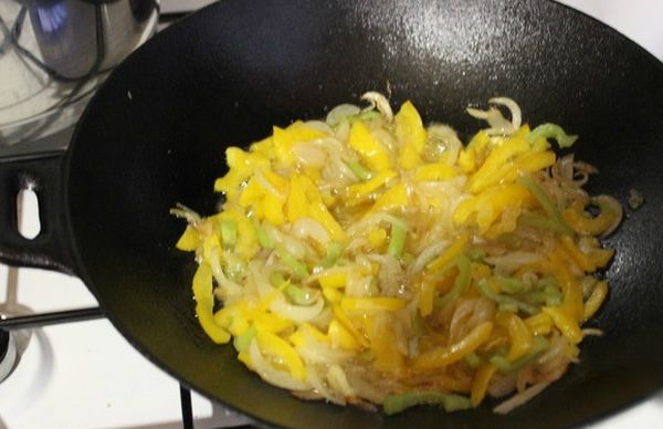 - Очистить лук и нарезать полукольцами. Обжарить на растительном масле до мягкости. Затем высыпать на сковороду к луку болгарский перец, нарезанный соломкой. Жарить 5 минут.