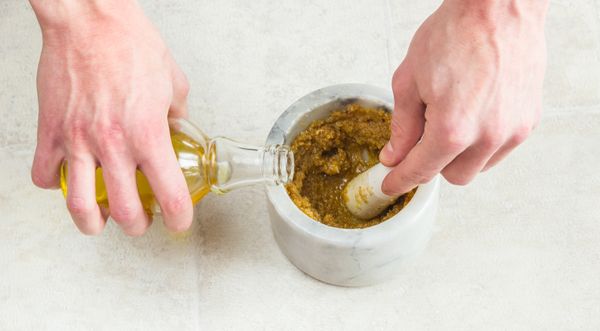 - Постепенно влить оливковое масло, не останавливая работу пестиком. Перемешать до однородной массы. Оставить настаиваться в течение 1,5 часов.