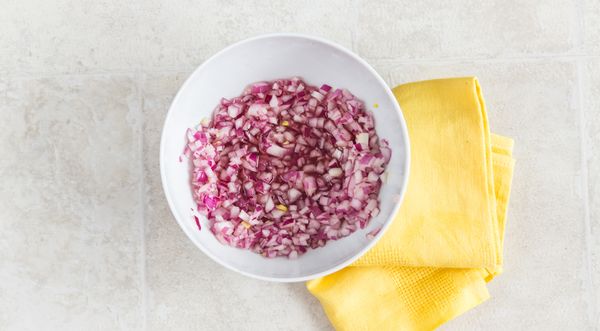 - Очистить красный лук и мелко нарезать. Затем залить уксусом и оставить мариноваться.