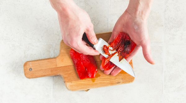 - Болгарский перец промыть, а затем сверху смазать оливковым маслом. Выложить на противень и запекать в духовке 10 минут при температуре 200 градусов. Доставать перец нужно тогда, когда на его поверхности образуются черные пятна. Спустя несколько минут удалить семена и кожицу.