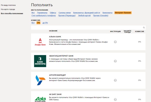 - Чтобы пополнить счет через интернет-банкинг, нажмите в списке слева «Все способы пополнения», затем в верхнем списке «Интернет-банкинг» и выберите нужный банк с 0% комиссией.