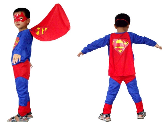 Для костюма этого сверхсильного доброго персонажа нужно надеть на ребенка синюю футболку и брюки или шорты того же цвета, на плечи надеть красный длинный плащ (из любой ткани, просто свободно падающей вниз), а на груди нарисовать или прикрепить эмблему — большую латинскую красно-желтую букву «S» в треугольнике.