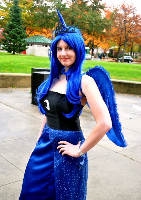 Многие девочки любят мультфильм «Мой маленький пони», и порадуются костюму любимых героинь. Луна — пони-королева, владычица ночи и луны. Для ее костюма вам потребуется синее платье, распущенные, убранные назад волосы, щедро посыпанные синими блестками, и рисунок на бумаге, который крепится на бок платья — белый лунный серп и несколько звездочек. К платью сзади прикрепите хвостик — он должен быть пышным, темно-синим и тоже густо усыпанным блестками.