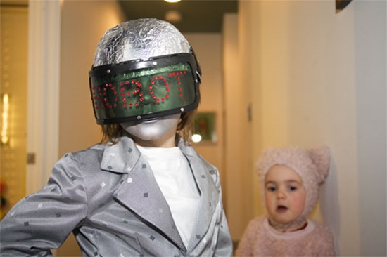 Оклейте картонки фольгой и составьте из них «костюм-броню». Все части должны состоять из прямых или острых углов. Можно сделать костюм ярким, использовав фольгу разных цветов. Также нарисуйте на ней — на уровне груди — побольше кнопок, а к одной из «рук» прикрепите картонный бластер или сделайте «карман», куда можно положить водяной пистолет.