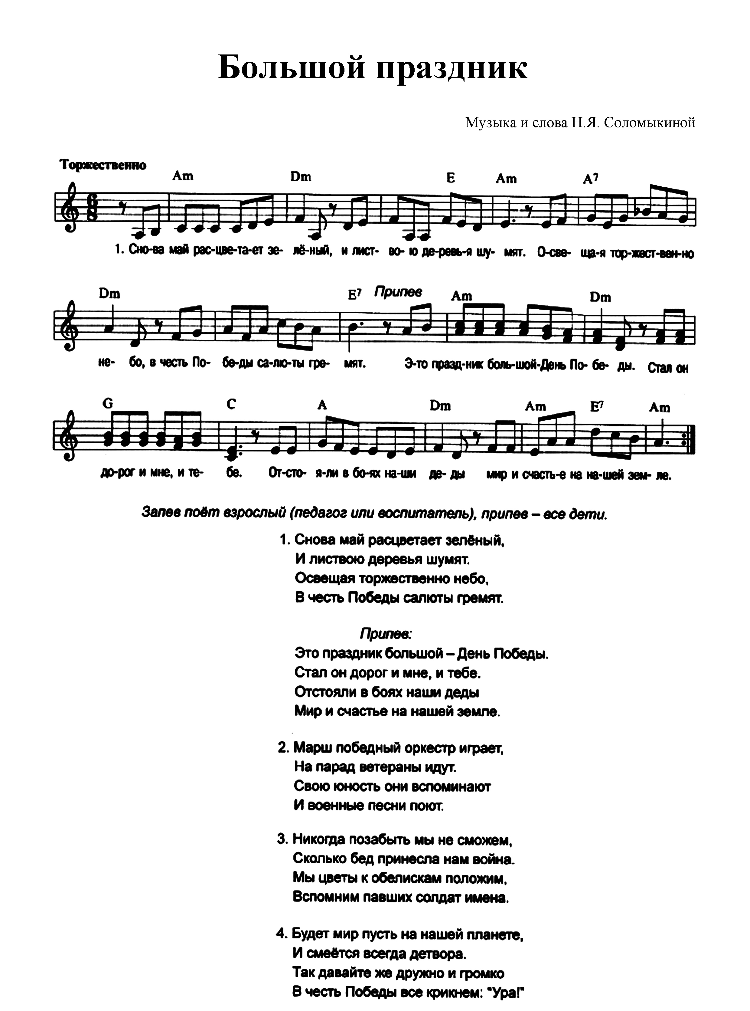 «Большой праздник» — удивительно яркая, радостная и оптимистичная песня про 9 мая. Каждое ее слово, нота и строчка проникнуты чувством гордости за великий подвиг, совершенный русскими солдатами в период Великой Отечественной войны. Исполняя это произведение, дети переживают невероятно сильные эмоции. Через их сердца проходит дух военного прошлого нашей славной Родины, и они начинают больше ценить мирное настоящее, которое им обеспечили ветераны. Кроме того, текст призывает всегда помнить и свято чтить память тех, кто отдал свою жизнь за светлое будущее, радость и счастье подрастающего поколения. Песня написана таким образом, что основные куплеты запевает учитель или воспитатель, однако, от этого варианта вполне можно отойти и сделать солистом кого-нибудь из учеников с сильным голосом.