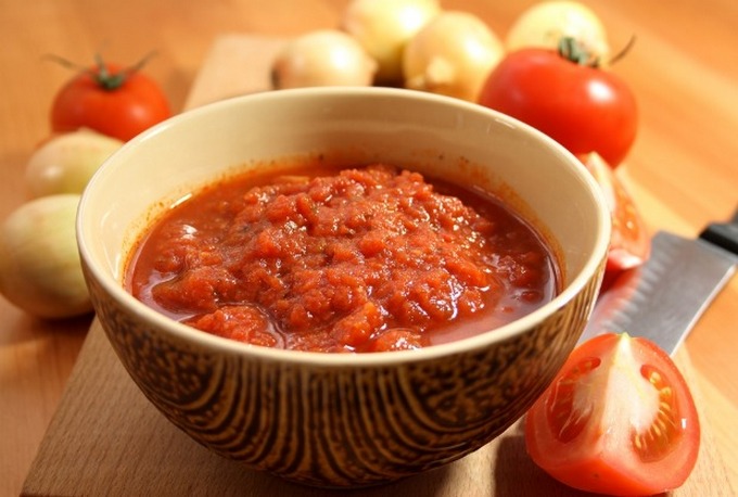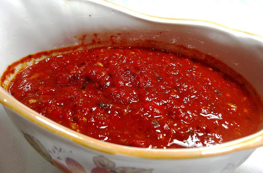 Если соус планируется кушать только зимой, его обязательно проваривают, закатывают под металлические крышки и хранят в погребе. Ну а те, кому невтерпеж сразу попробовать овощное лакомство, могут обойтись без варки, а просто перемешать все компоненты и отправить массу в холодильник. Через сутки она станет вполне пригодной к употреблению в пищу.