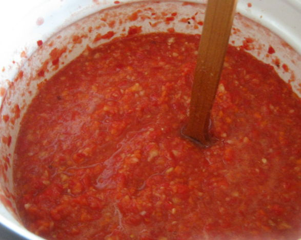 - Проварить соус на медленном огне примерно 45 минут, в конце добавить пропущенный через пресс чеснок, вымешать до однородности и в горячем виде расфасовать по стерилизованным сухим банкам. Закатать железными крышками, перевернуть вверх донышком, укутать одеялом и остудить. Потом убрать на хранение в кладовку или подвал.