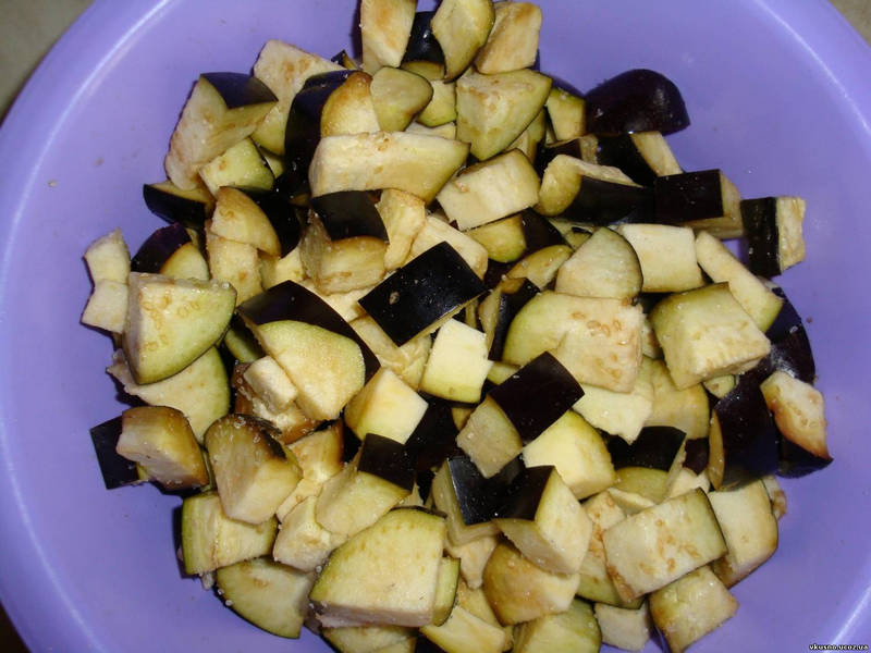 - Синие тщательно вымыть, хвостики удалить и разрезать овощи на небольшие кусочки.