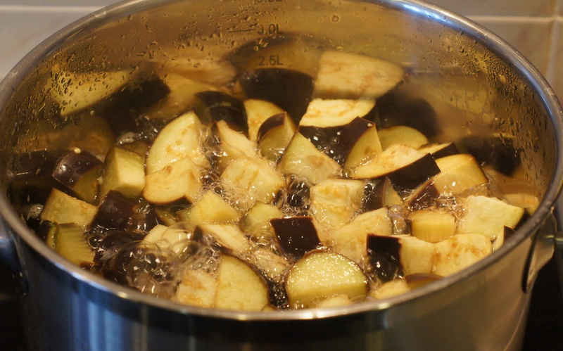 - Синие откинуть на дуршлаг и дать стечь жидкости, затем сполоснуть под проточной водой. Потом опустить овощи в кипящий маринад, проварить 5-7 минут, вынуть шумовкой и немного остудить на деревянной доске.