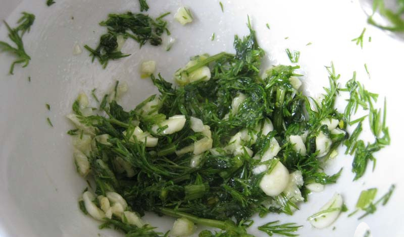 - Чеснок очистить от шелушек и очень мелко нашинковать или пропустить через пресс. Потом залить кипящим растительным маслом, перемешать с мелко рубленным укропом и оставить на несколько минут пропитываться.