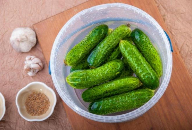 - Огурцы вымыть, краешки отрезать и замочить в ледяной воде на 3 часа.
