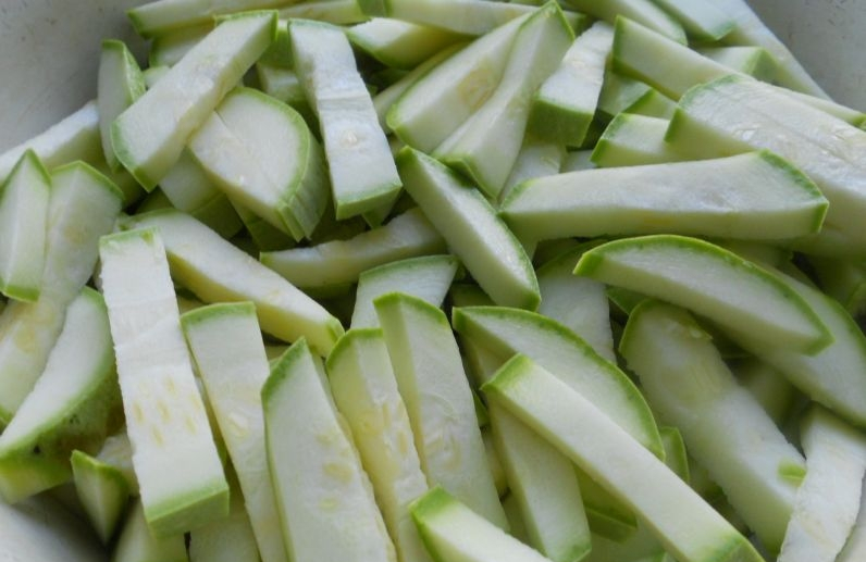 - С кабачков срезать шкурку и порубить произвольными ломтиками.