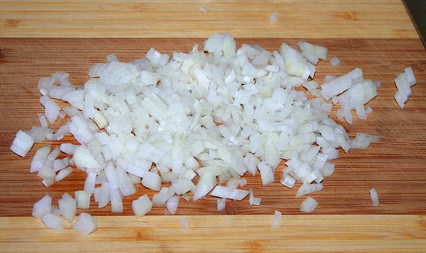 - Лук тонко нашинковать и припустить на сковородке до мягкости.