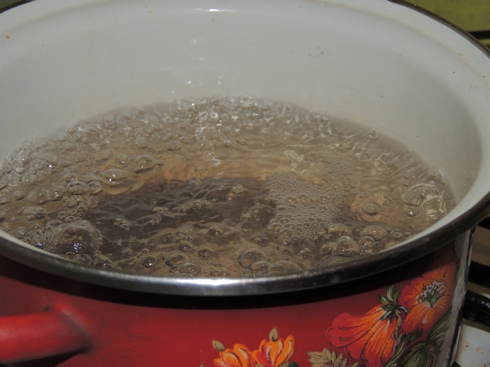 - Переложить овощи в эмалированную кастрюлю, определить на плиту и на небольшом огне довести до кипения.