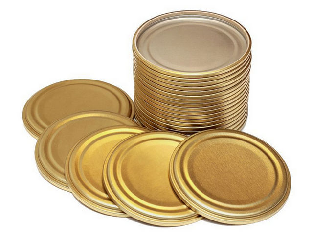- Металлические. Наиболее популярные и востребованные. Сочетают в себе разумную цену и отличные механические характеристики. Имеют внутренне прокладочное кольцо из прессованной резины. Оно обеспечивает плотное прилегание края крышки к банке и гарантирует, что извне во внутрь ничего не попадет. Железные крышки подходят для закатки любых видов продуктов, включая скоропортящиеся. Изделия из белого металла проявляют склонность к окислению, поэтому с их помощью укупоривают только не содержащую уксуса консервацию (варенье, желе, джем, компот и пр.). Для банок с помидорами, огурцами, грибами и овощными салатами обычно выбирают крышки золотистого цвета с внутренним лаковым покрытием, устойчивым к кислой среде. Чтобы укупорить емкость под «железку» требуется специальная закаточная машинка (ручная, автоматическая либо полуавтомат). Единственным минусом является лишь то, что простой крышкой из металла невозможно воспользоваться во второй раз.