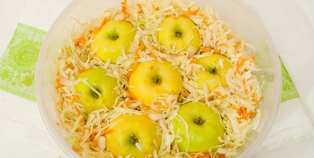 - Яблоки тщательно вымыть и уложить слоями в тазик или большую кастрюлю. Капустно-морковную массу натолкать в пустоты и разложить поверх яблок слоем в 2-3 сантиметра.