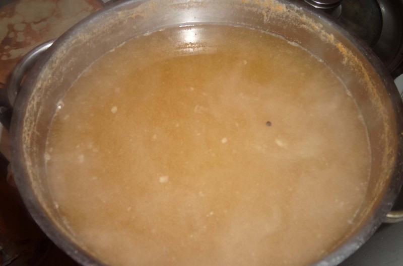 - Когда рассол покроется специфической пленочкой, слить его в эмалированную кастрюлю, прокипятить на сильном огне не менее 5 минут.