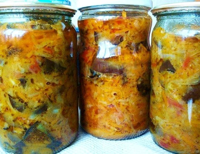 - На дно сухих, чистых банок уложить специи, налить теплое масло, сверху плотно расположить овощи, простерилизовать емкости необходимое количество времени (в зависимости от объема тары), закатать металлическими крышками, перевернуть вверх донышком, укрыть одеялом и охладить, на хранение отнести в погреб или кладовую.