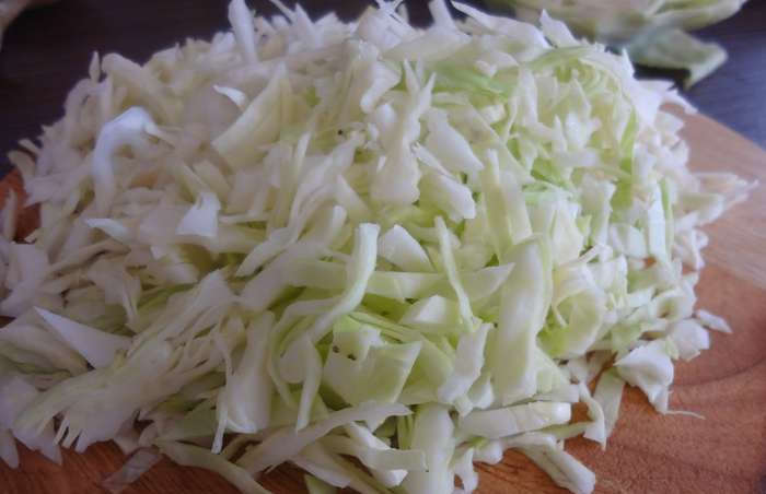 - Капусту освободить от 2-3 внешних листьев и порубить тонкой соломкой.